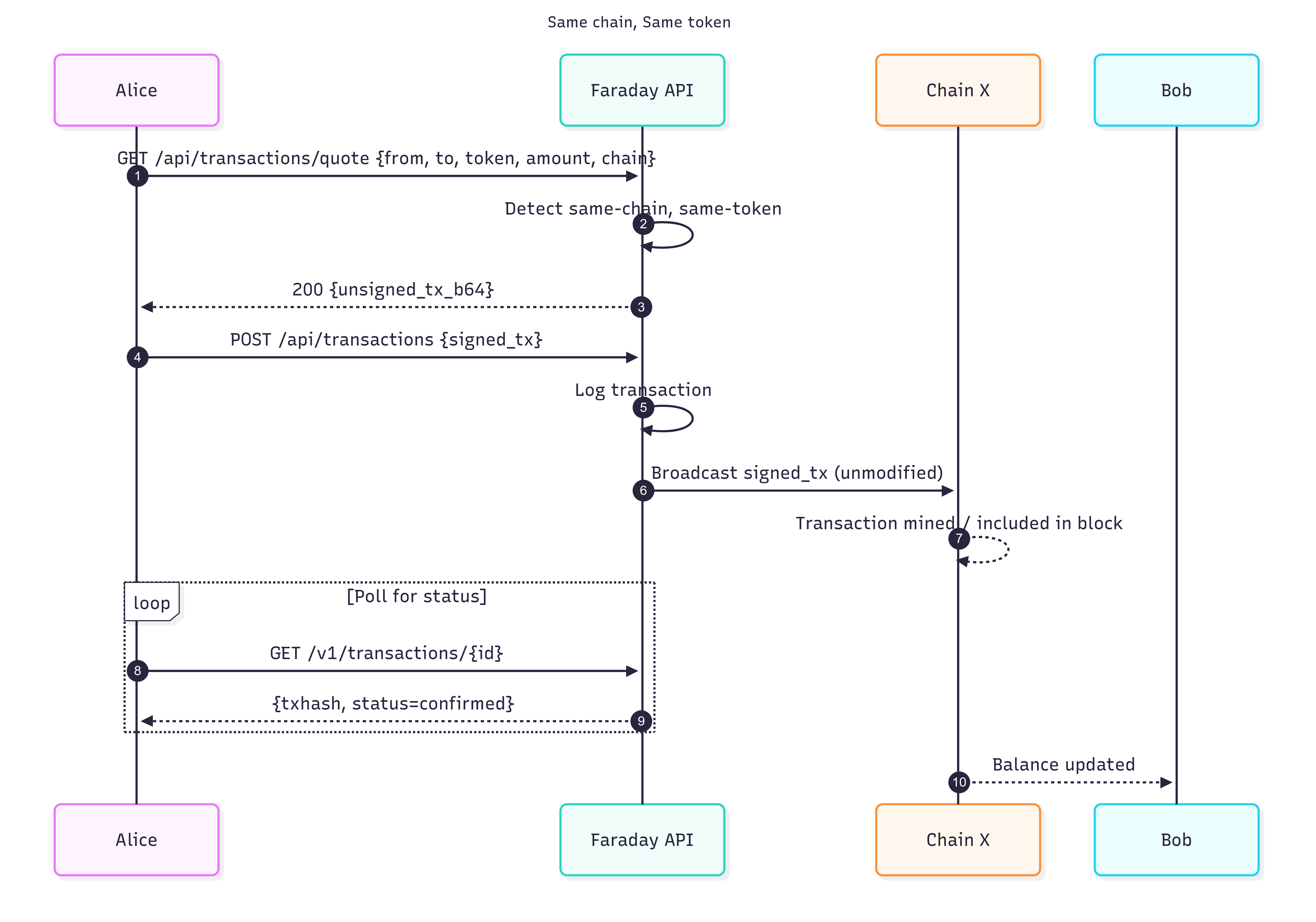When Alice transfers USDC to Bob on the same chain (e.g., Solana), Faraday bypasses external aggregators and generates a direct transfer transaction. Transaction Flow:- Request Quote — Alice specifies source chain, token, amount, and destination address