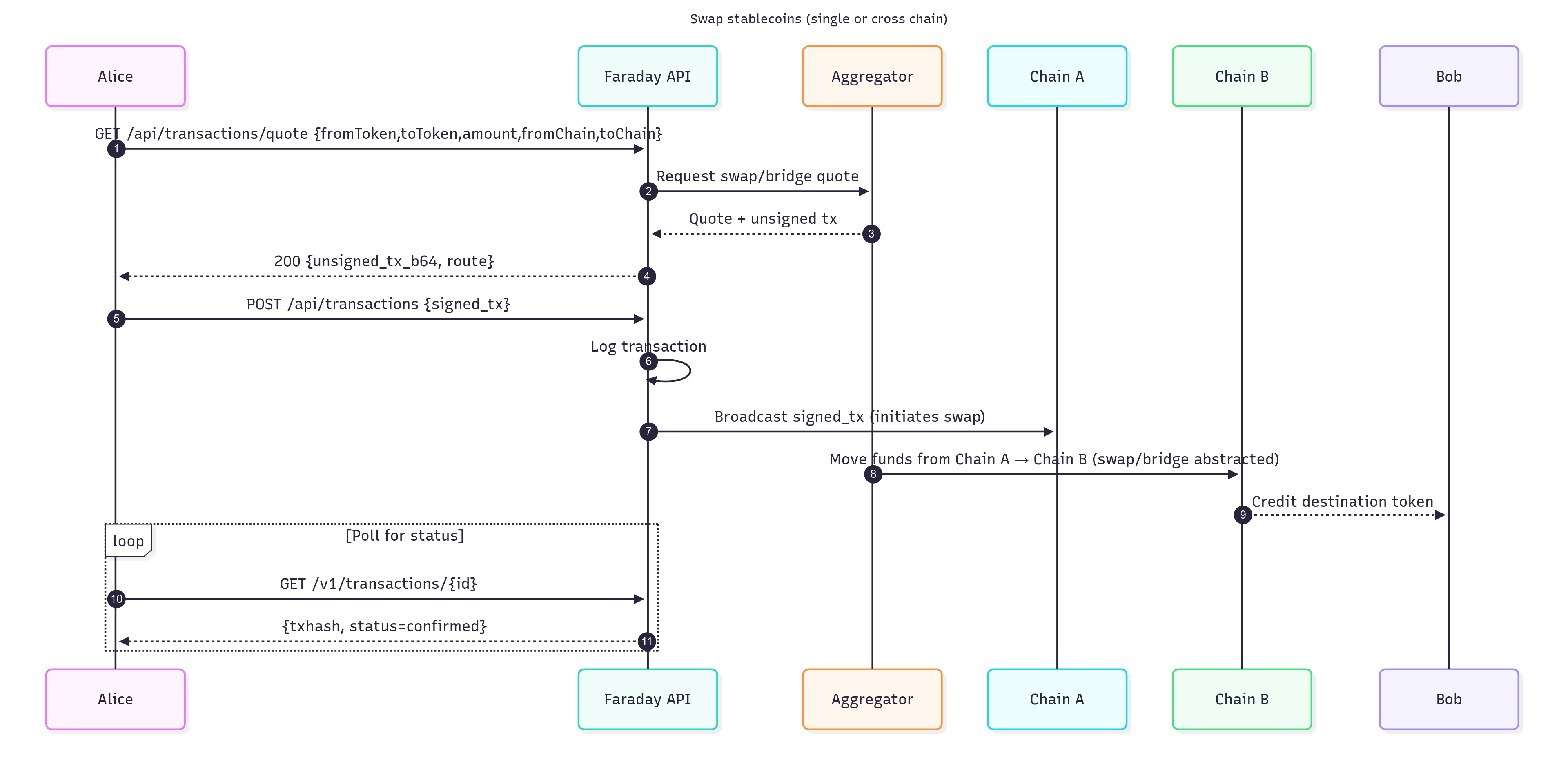 When Alice wants to swap stablecoin A for stablecoin B (either on the same chain or across chains), Faraday queries multiple aggregators to find optimal routing. Transaction Flow:- Request Quote — Alice specifies source chain/token, destination chain/token, and amount