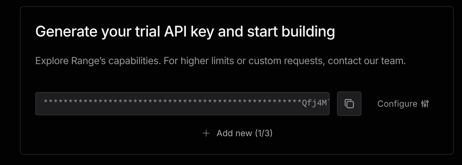 Get immediate access to Range’s enterprise-grade risk, compliance, and intelligence APIs. This guide walks you through account creation and API key generation—no credit card required.Create Your Account & Generate an API Key